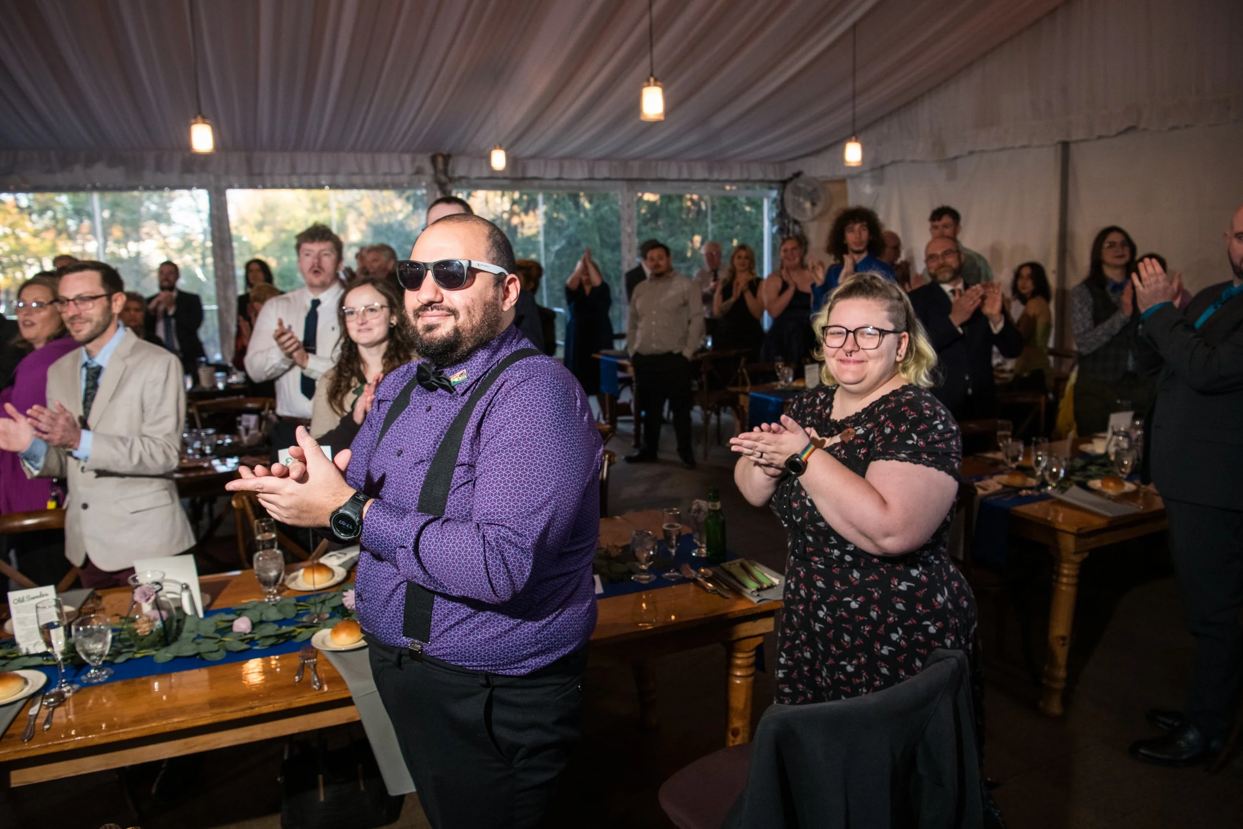 The ceremony’s over, we’ve walked up the big hill to the tune of “Can’t Take My Eyes Off Of You”, and now it’s time for the party! A note about these photos before we get started: you may have noticed that we had a whole crew of people working the wedding. Tom Fuller and his amazing group had two cameras running to cover all the action, so some of these photos may seem to jump around from subject to subject. That’s because we’ll be sharing them as they came to us, which is the chronological order they were taken. So when you’re looking at some great shots of tables and it suddenly jumps to the wedding party, or later when there’s personal shots of Grace and Brian among shots of dancing under the tent, that’s why!